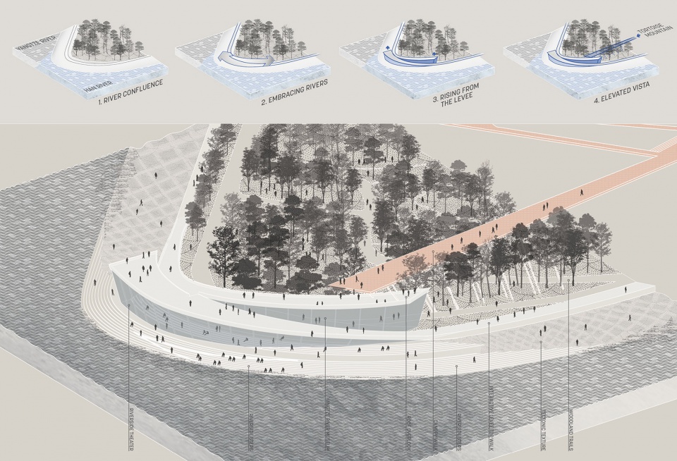 Wuhan’s Yangtze Riverfront Park leverages the river’s dynamic flooding to nurture a rich regional ecology, reinforce traditional wisdom and the local identity of living with an ever-changing river, and creates a dynamic recreational experience which is acutely attuned to the seasonal rise and fall of the Yangtze’s waters. This “river culture” is so deeply embedded in Wuhan that today people still frequent the riverfront parks even when they are flooded—enjoying the rare excitement of such intimate contact with the water. The design of the park celebrates this strong river culture and leverages frequent flooding events as a vital driver of placemaking strategies. Much of the programming along the river is designed to celebrate the river’s spontaneity and incorporate its flooding as an essential element of the ever-changing landscape.