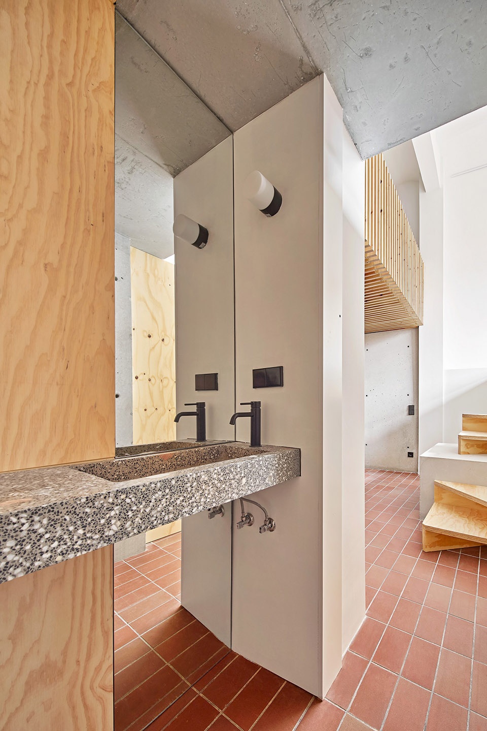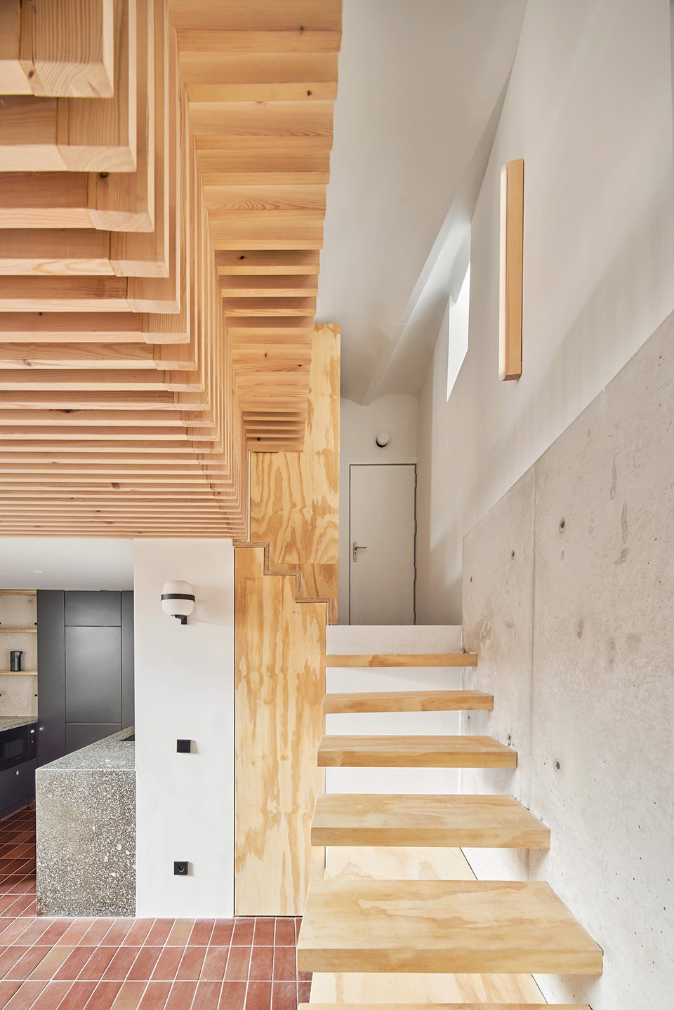 首先,团队决定重新定义每个空间的用途,并将不同楼层相互连通。他们选择了最适合空间衔接的自然色调手作材料来运用在五层楼中,通向室外的两个自由出口也彼此连通。地下室底层被由下至上地改造成一间可以直接通向庭院的明亮套房。为了将这层楼融入整套屋子,并为其提供一个从内部进入的通道,则必须要开凿1.2米的土地以建造新的楼梯。这种干预系统既确定了房屋的特征,也成为了其中的核心元素。挖掘工程创造出一个被裸露混凝土挡土墙环绕的双重高度空间。