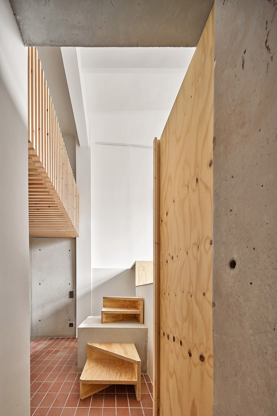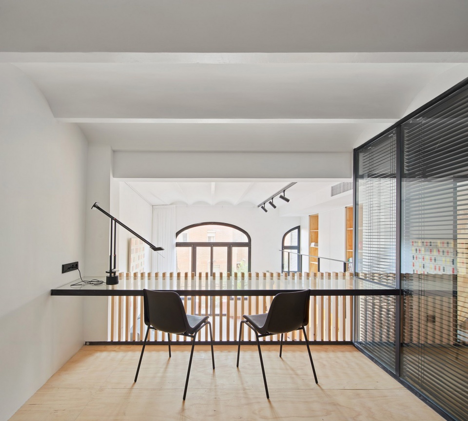 木制锻件被引入空间以强化结构,并在空间之间充当半透明的过滤器。它赋予了空间温暖的气息,形成了具有强烈视觉力量的板条雕塑。一方面,水平的木板条标志着地板之间的过渡。另一方面,垂直板条也被用来打造工作室的桌子和长凳。