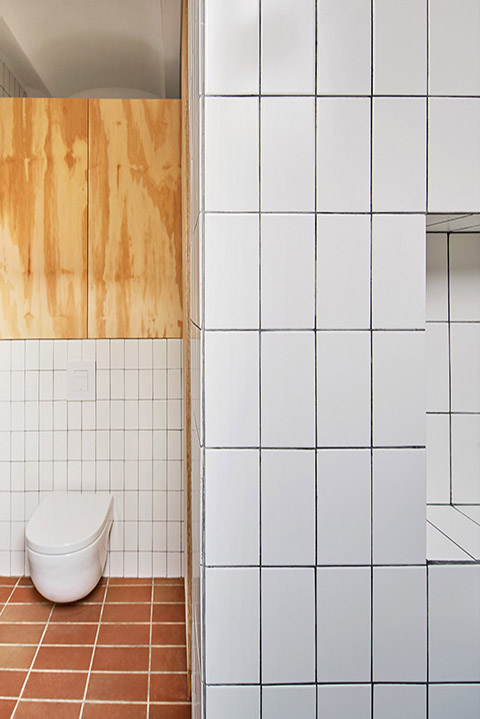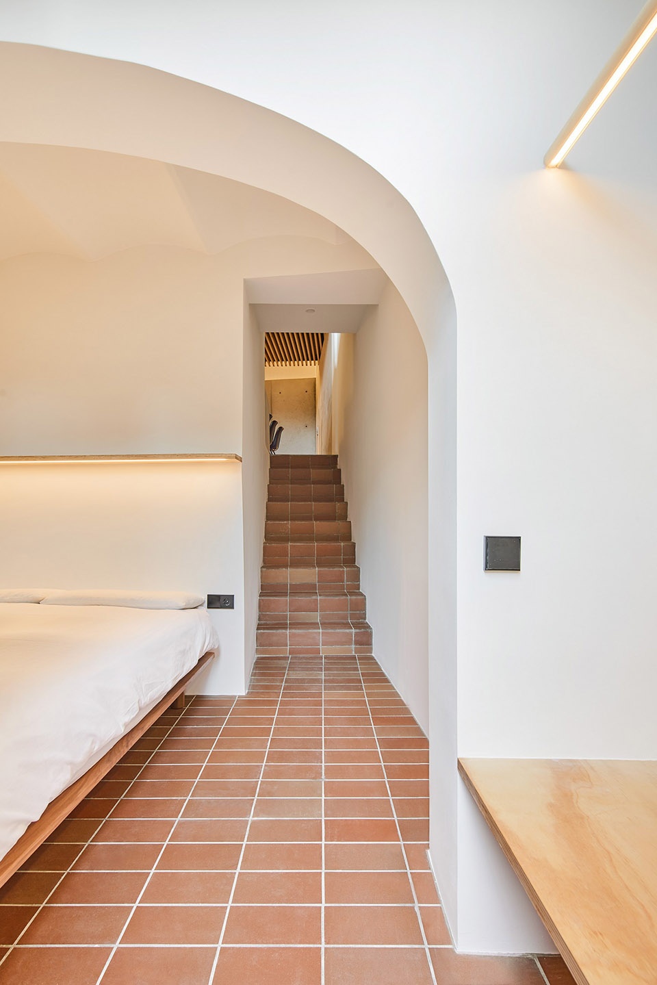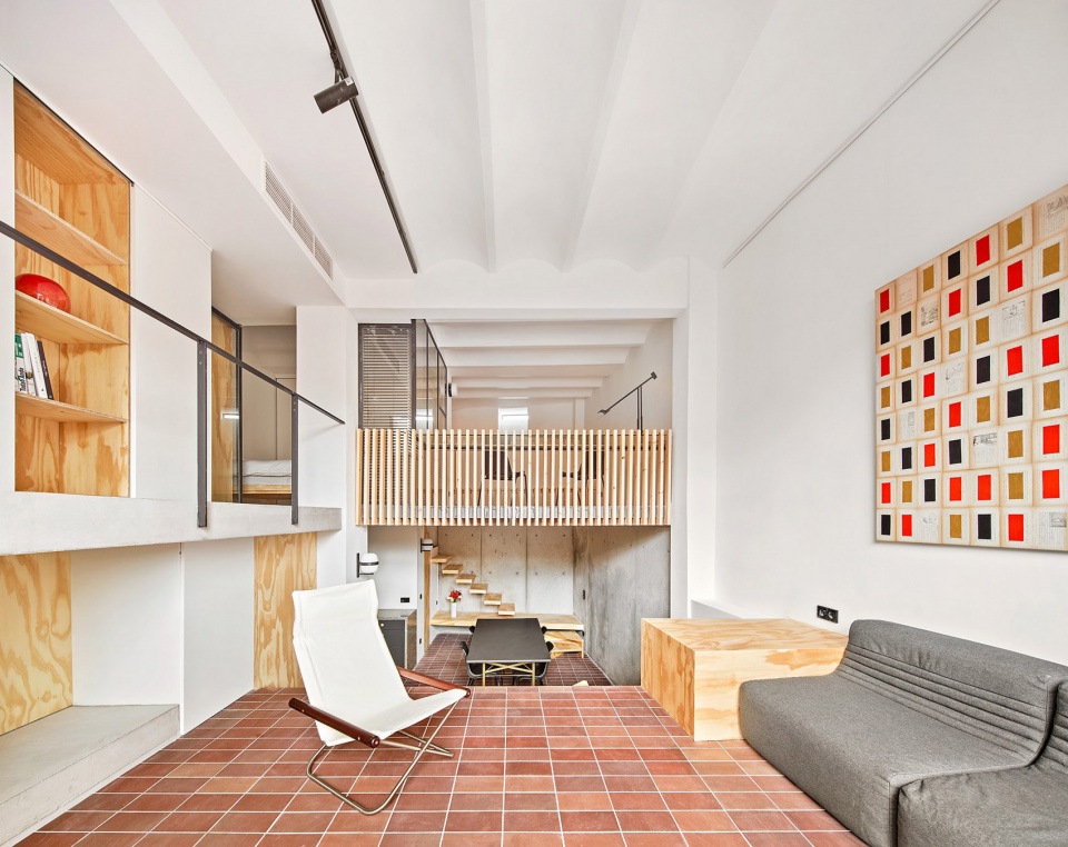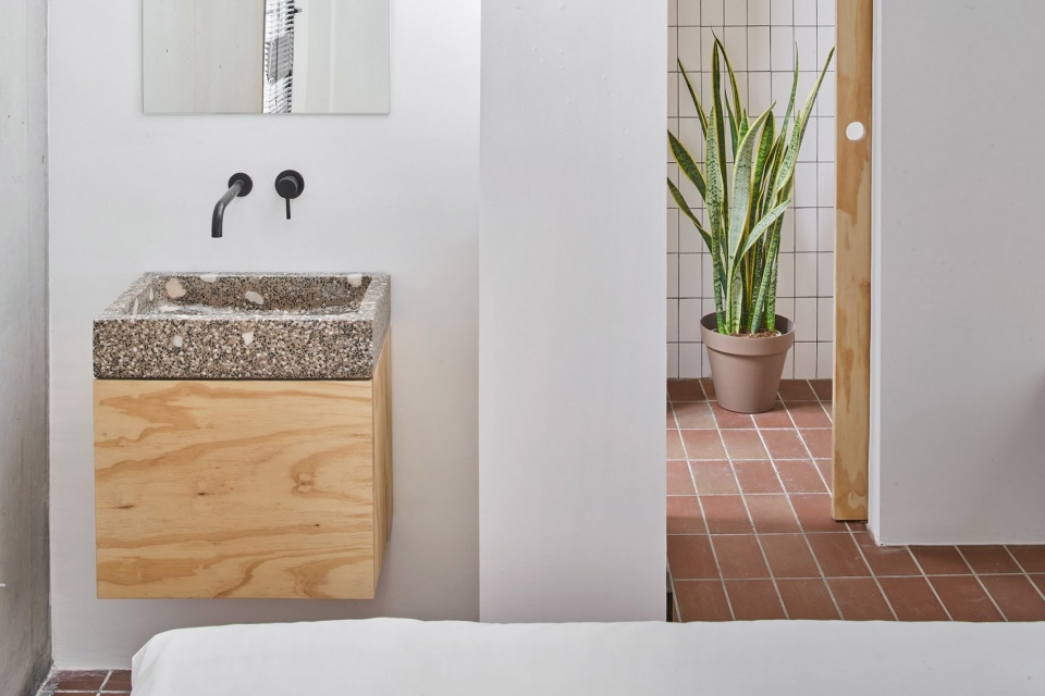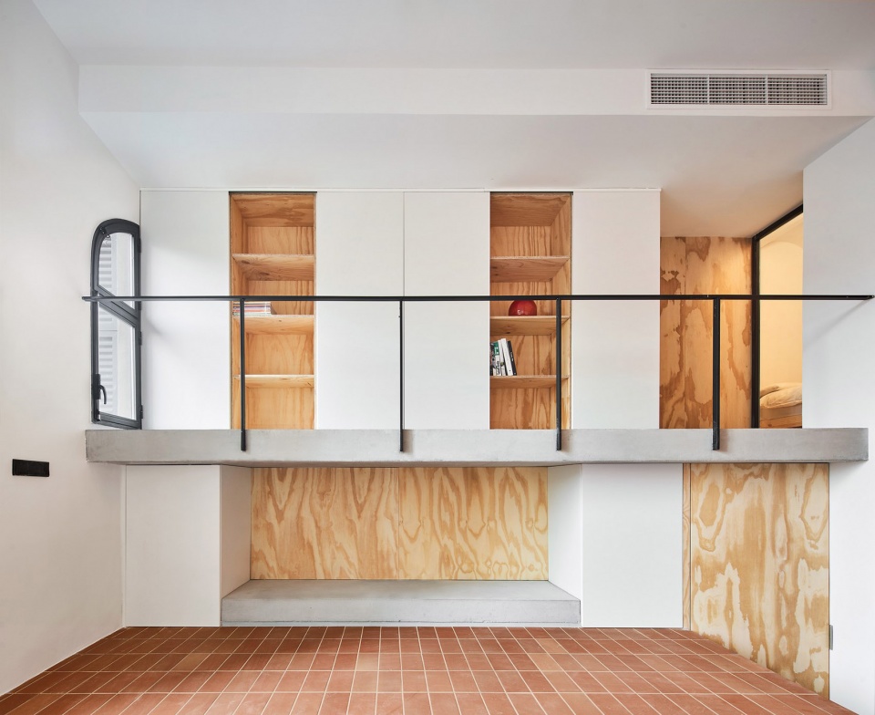 团队在上述更衣室的下方打造了一个“壁龛”(凹间):在“和室”(一种传统日式房间)的上方升起的一个小空间,其中放置了带有传统日式装饰元素的物品。除了不同的层次和用途之外,屋内所有的空间交流都非常顺畅。液压陶瓷的红褐色地板更是在空间中建立起了一种连续的关系。